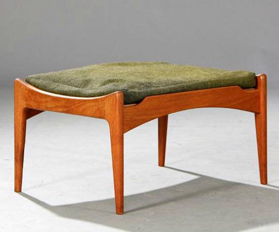 A teak footstool. Loose cushion upholstered with green wool