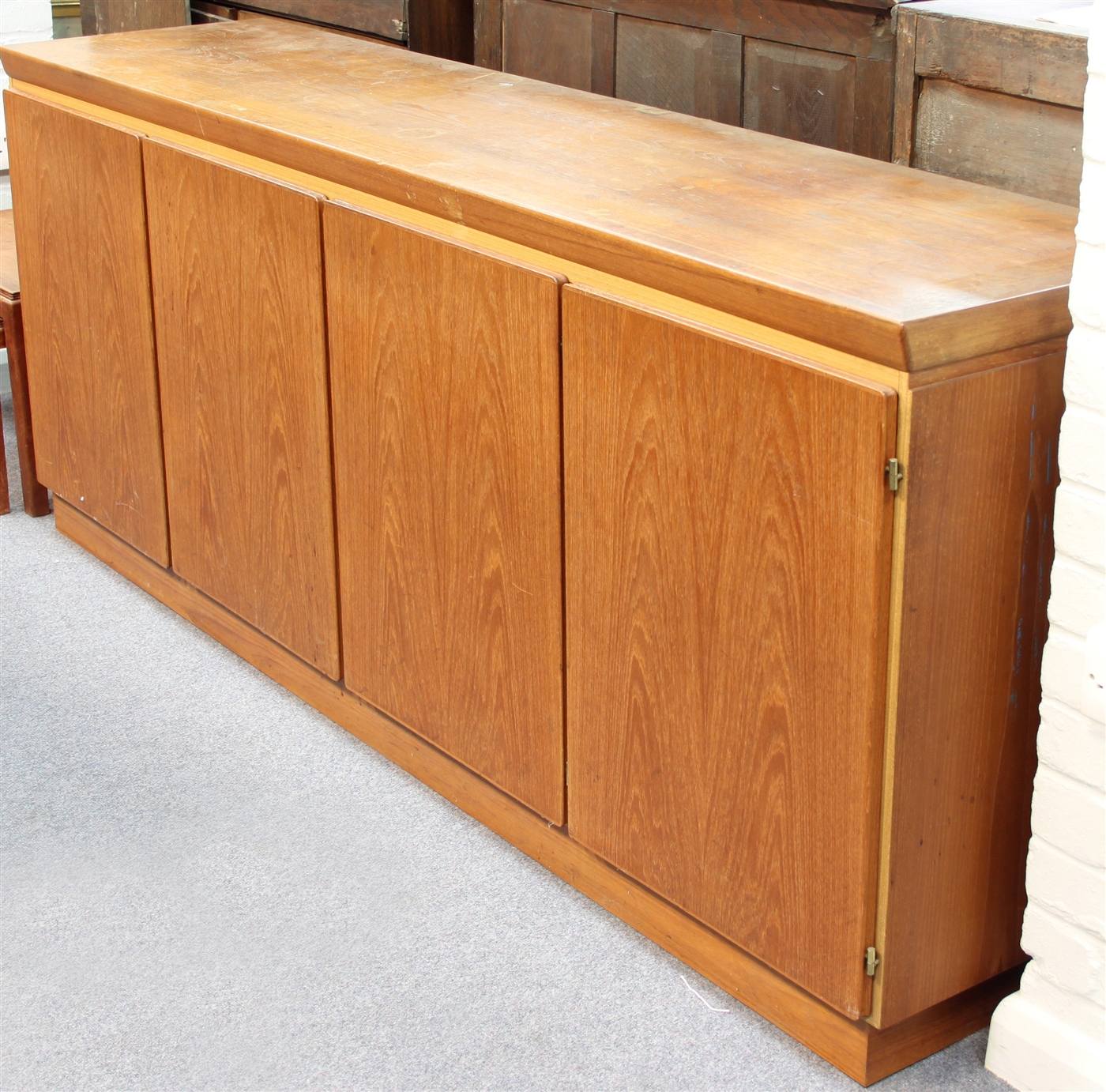 A teak sideboard of plain rectangular form fitted with four panel doors