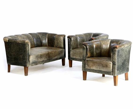 A three-piece set of furniture consisting of a sofa and a pair of armchairs; green leather cover