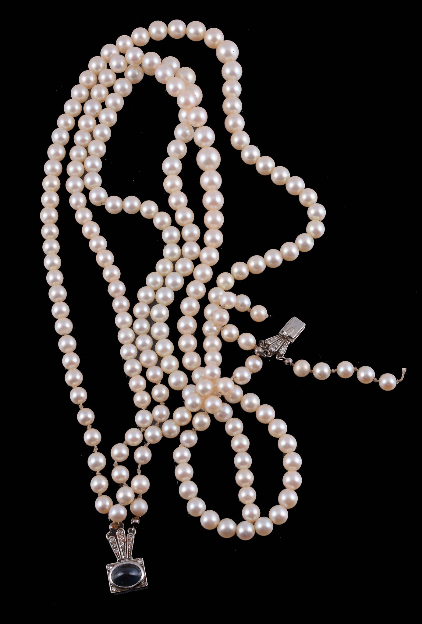 composed of three strands of slightly graduated cultured pearls, to a box snap clasp set with eight cut diamonds, 54cm long