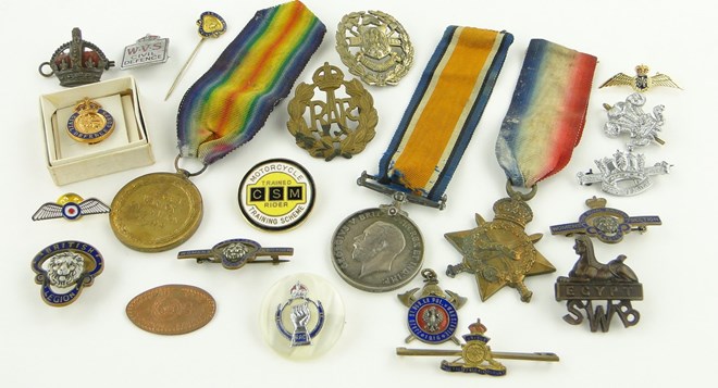 A trio of First War medals, awarded to Gnr. W Fredman RA, 76320, together with other military badges, etc.