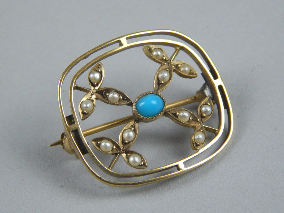 A turquoise and seed pearl brooch, in oblong form, 2.5cm wide, 2.8g all in