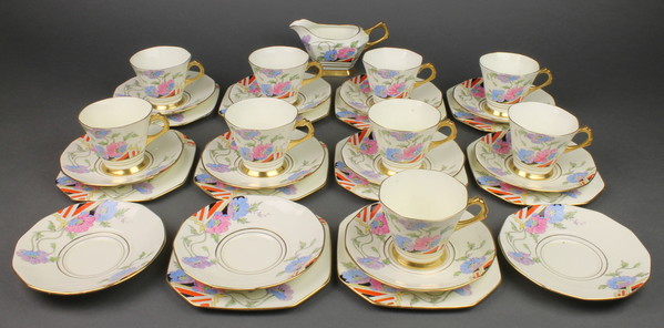 A Tuscan china Art Deco tea set with floral decoration and gilt rims comprising 9 tea cups