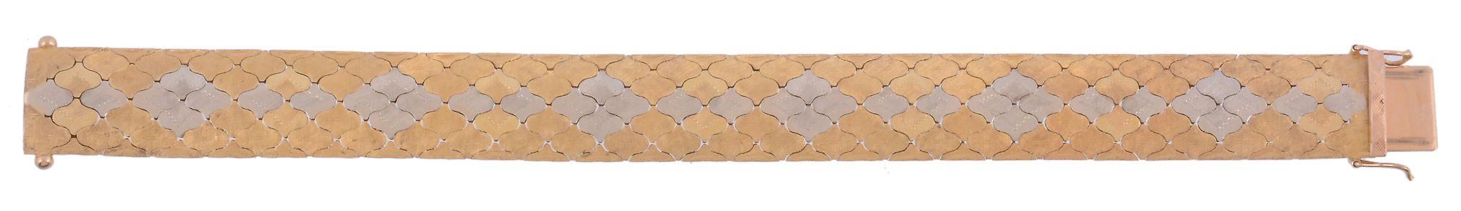with shaped textured panels, the concealed clasp stamped 750, 48g, 19cm long