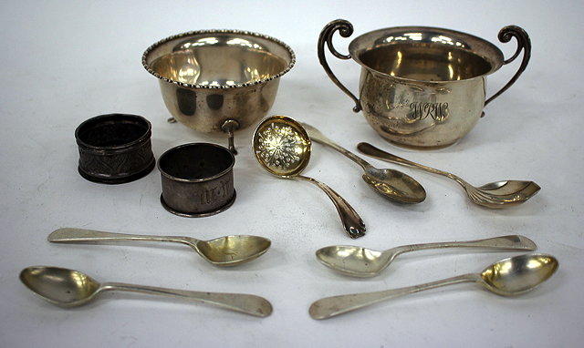 A TWO HANDLED SILVER BOWL together with a set of four silver tea spoons, a silver sugar sifter, a further small silver sugar bowl etc