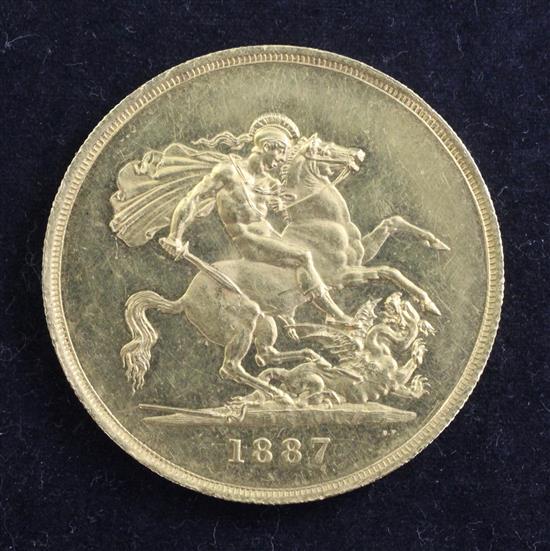 A Victoria Jubilee gold five pounds, 1887, some wear to edge otherwise EF