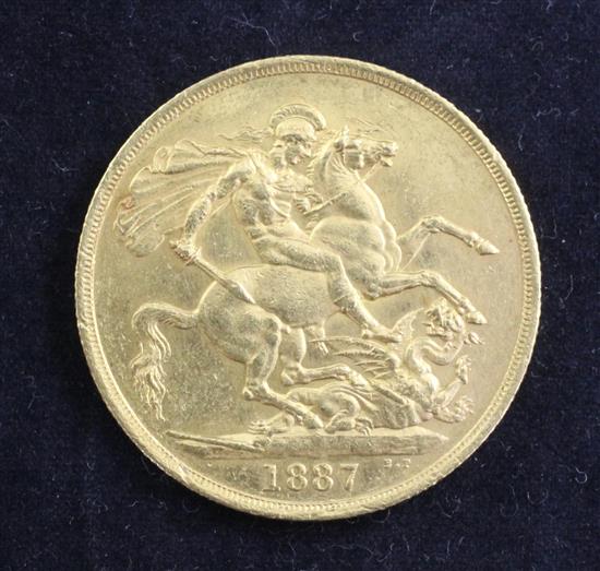 A Victoria Jubilee gold two pounds, 1887, edge scratches to reverse otherwise good VF