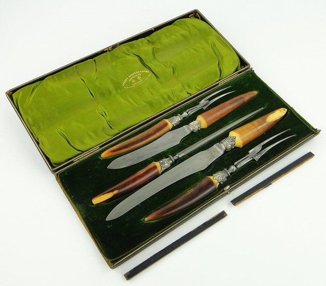 A Victorian 5-piece stained ivory handled carving set, by Joseph Rodgers, in original fitted case.