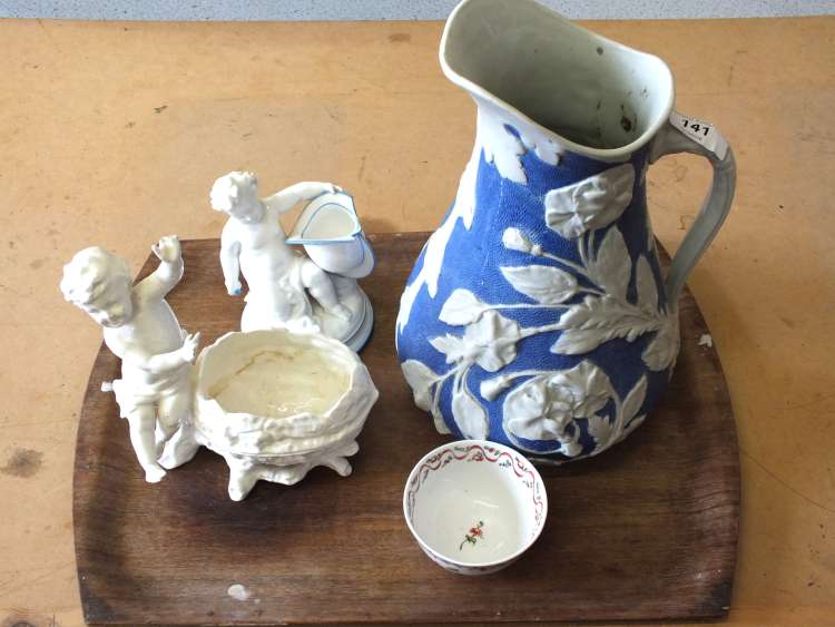 A Victorian blue and floral relief jug, two continental cherub vases and an English tea bowl