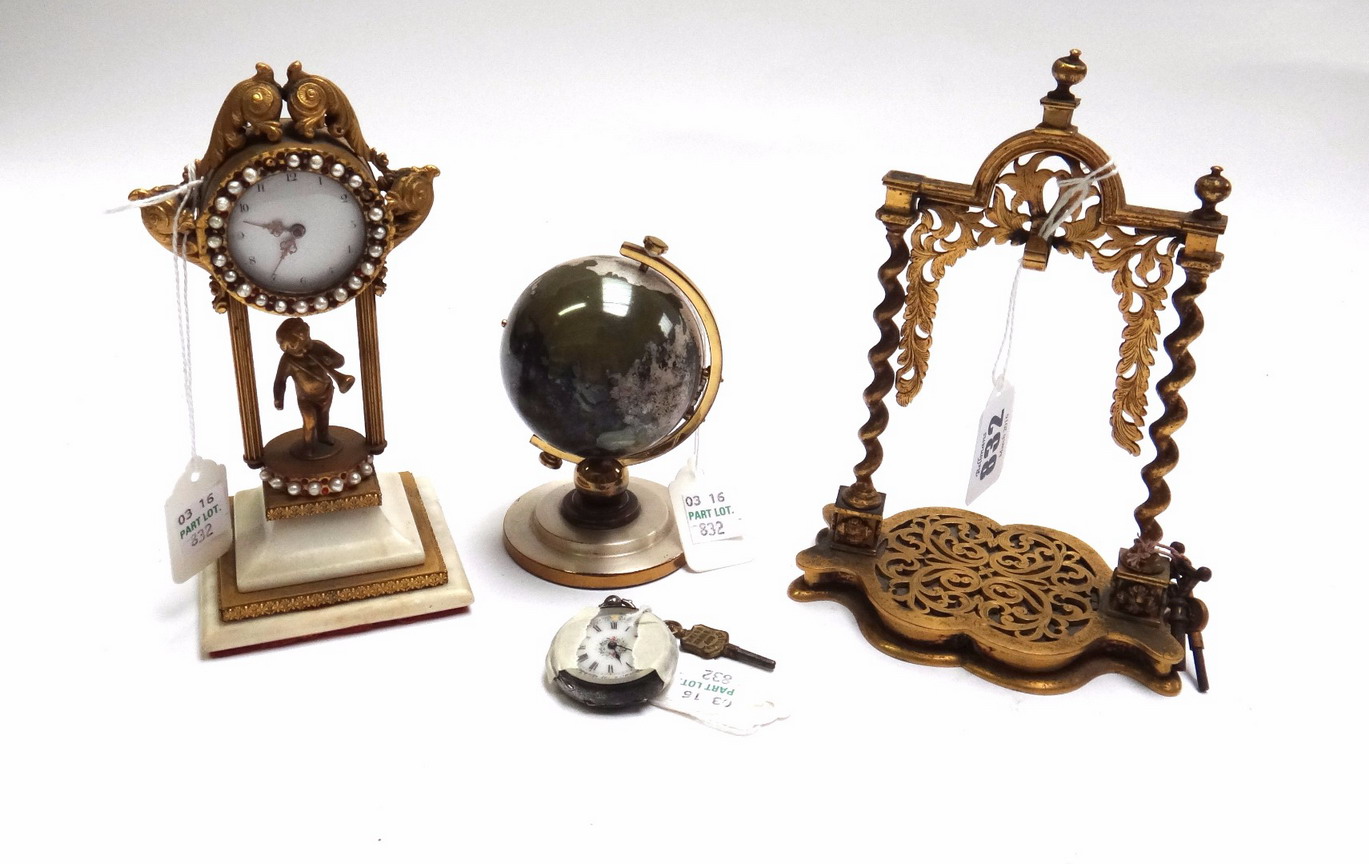 the frame raised on spiral twist columns, 16cm high, a lady's silver cased fob watch, a desk clock with white enamel dial with jewelled surround, 15.5cm high and a small desk clock of globe form