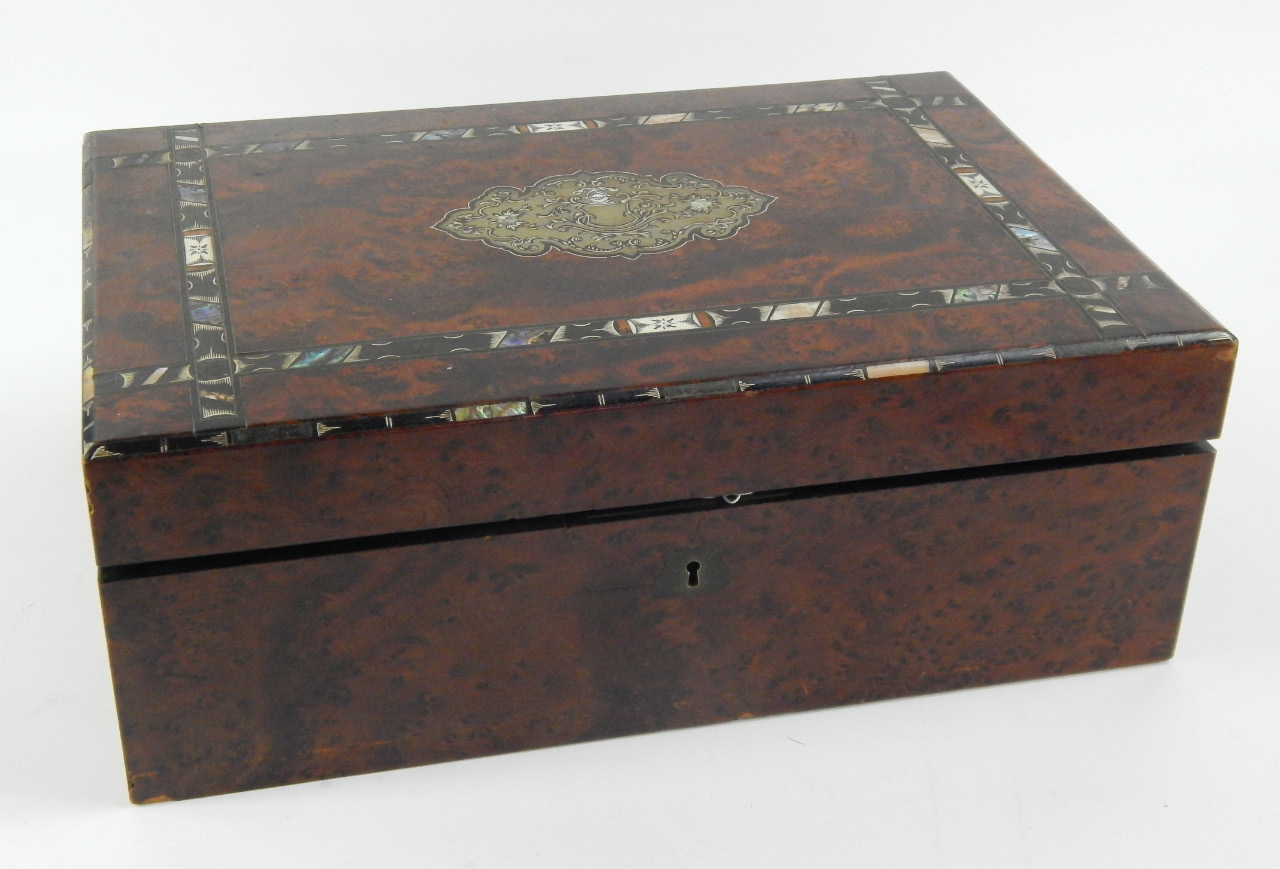 with ebony, ivory and mother of pearl inlay, brass and ivory plate to lid decorated with a reserve shield and helmet crest, faux rosewood interior