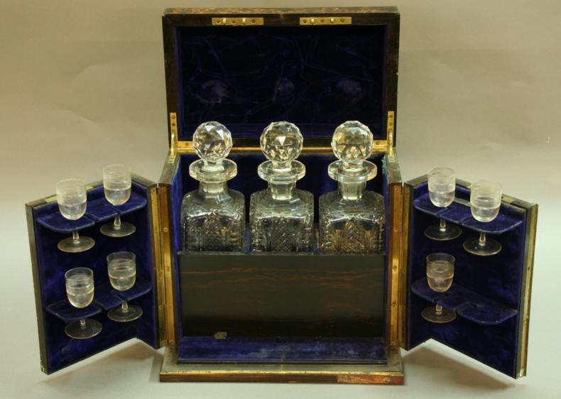 the hinged lid and pair of doors enclosing three decanters and stoppers and a set of glasses