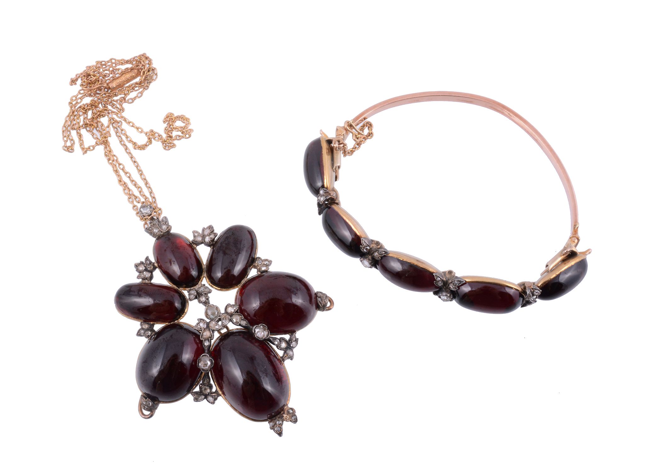 the pendant with graduated cabocohon garnets in the form of a flower, with rose cut diamond foliate detail between, 6.5cm long, on a belcher link chain; together with an oval cabochon garnet and diamond bangle, articulated between the garnets with fo
