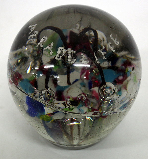 A VICTORIAN DUMP GLASS PAPERWEIGHT of domed form containing bubbles and various enamel colours within and with internal inscription 'Mr M R Radcliffe' 12cm high