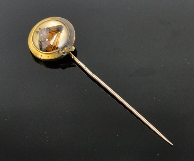 A Victorian Essex crystal horse design stickpin, gilt metal buckle design frame, 20mm across.