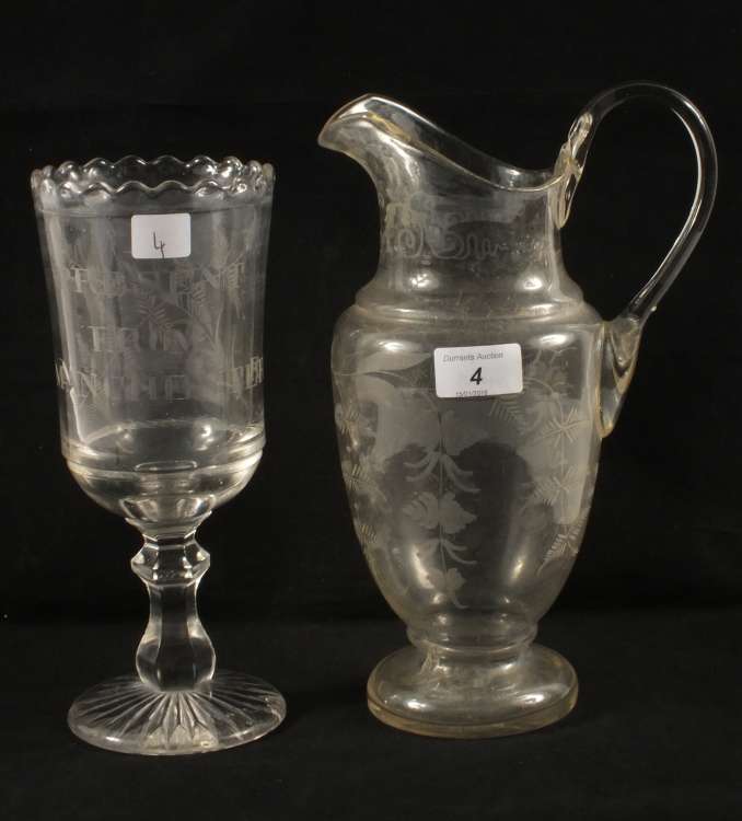 A Victorian glass water jug with fern leaf engraving and a celery vase marked 'A Present from Manchester'