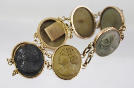 having seven lava ovals each carved with a female head, rub over surround, chain links and snap clasp