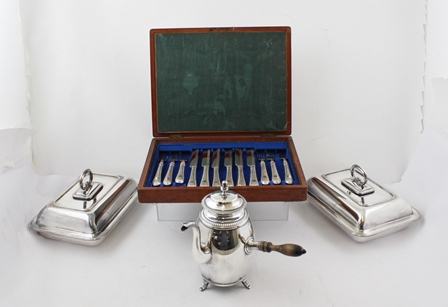A VICTORIAN MAHOGANY CASED SET OF DESSERT KNIVES AND FORKS FOR TWELVE, together with a pair of plated cushion form ENTREE DISHES, and a side handled POT, the cover with acorn finial