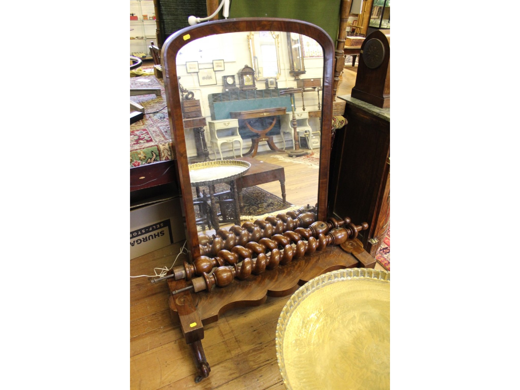 A Victorian mahogany Cheval Mirror, the arched plate on barley twist supports and shaped platform base on scroll feet