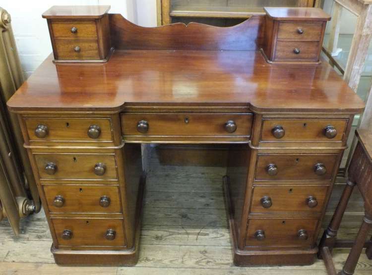 A Victorian Mahogany kneehole dressing table with nine drawers and turned handles