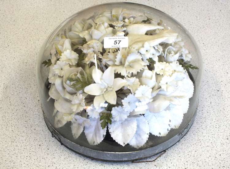 A Victorian paper floral memorial with white porcelain dove under squat glass dome