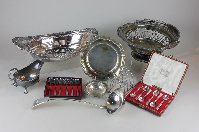 toast rack and basket, two cased sets of spoons and other silver plated items