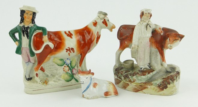 A Victorian Staffordshire cow creamer, height 7.25'', Staffordshire cow with figure and bowl and a smaller cow, (3).