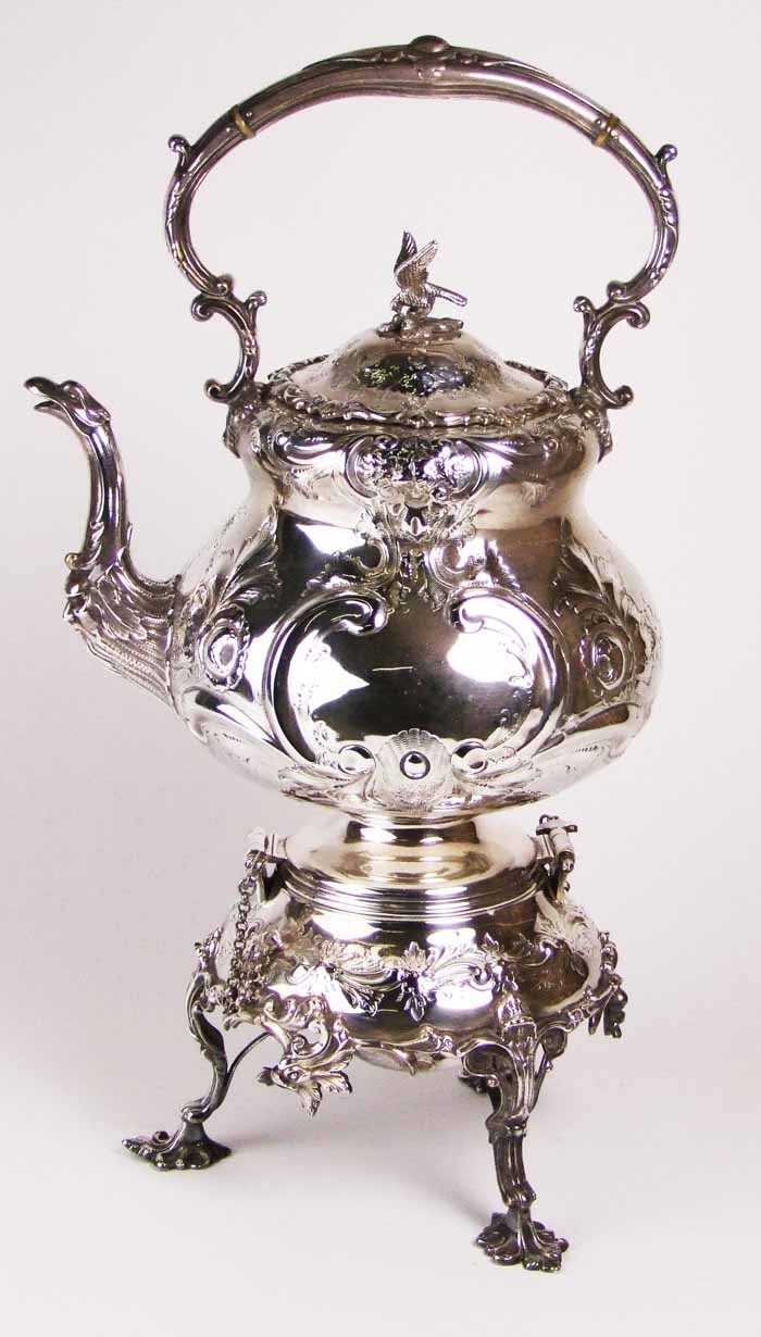 the kettle of bulbous form,with hawk finial and embossed with flowers and scrolls, the stand with dolphin heads and raised on three foliate scroll feet