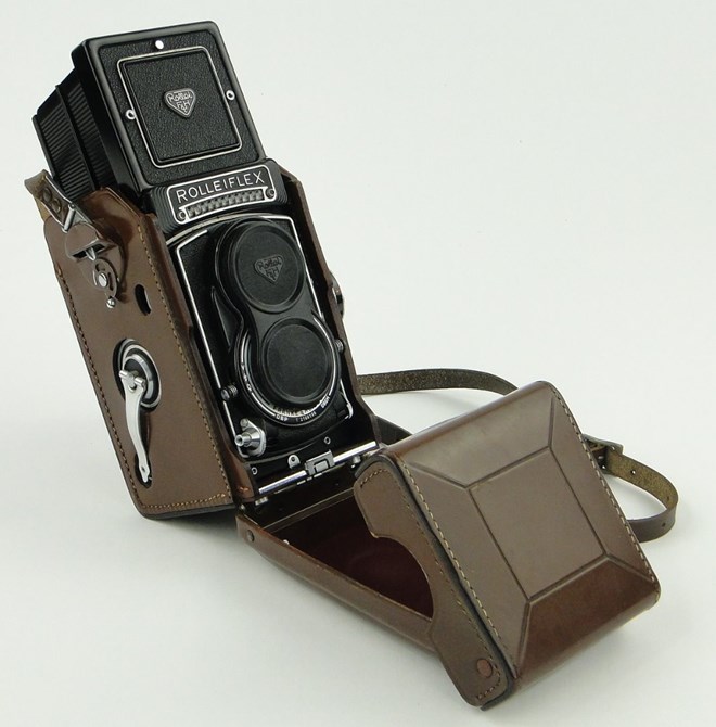 A Vintage Rolleiflex twin lens reflex camera, leather case, height 6''.