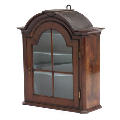 A walnut hanging display cabinet with curved top, front with vitrine door