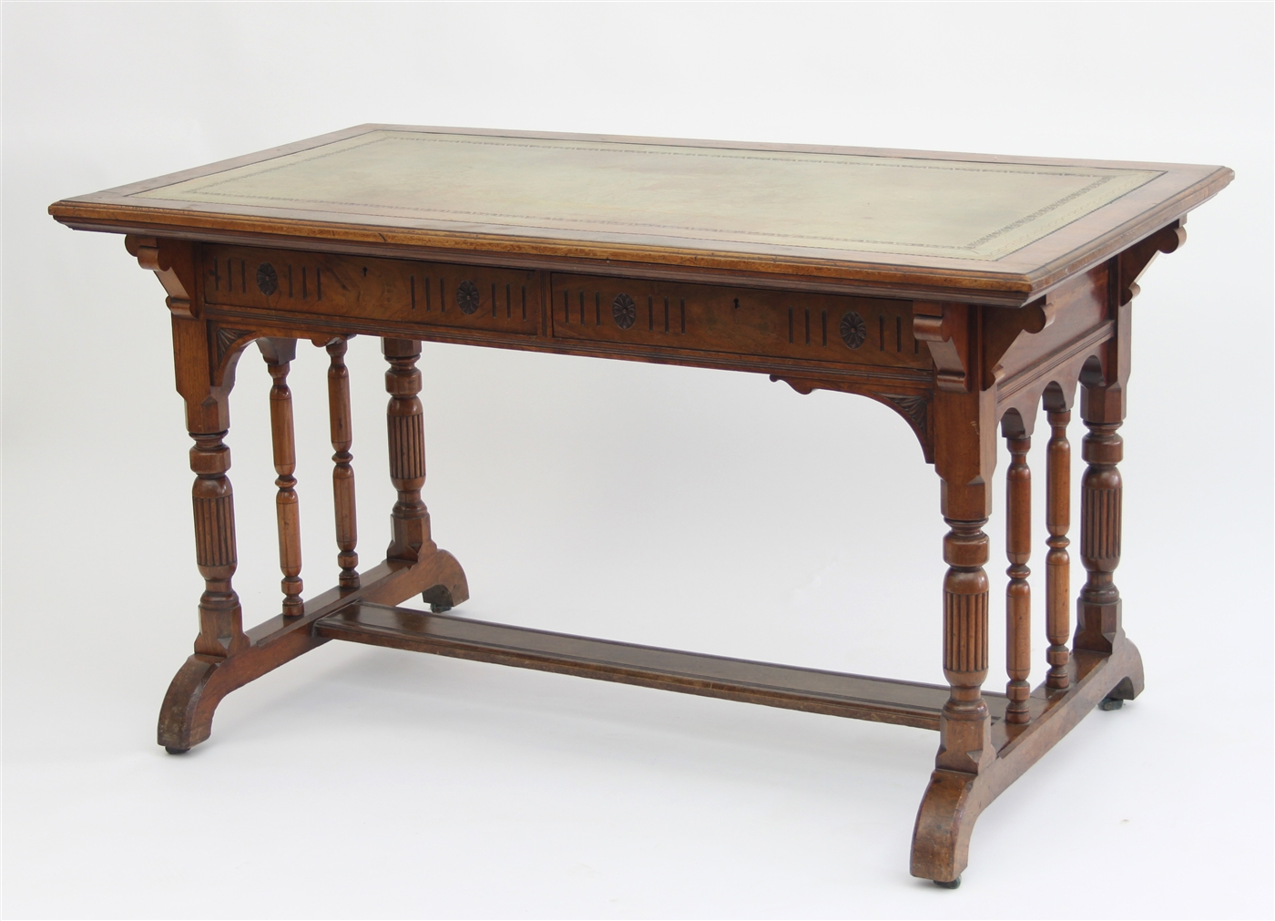 with green tooled leather inset top, on turned and reeded legs united by a triple stretcher