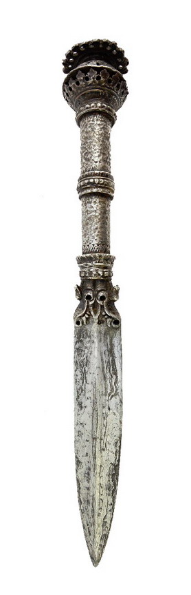 with a broad double edged blade rising from the mouth of two Makara heads forming the ricasso, the tapering engraved shaft with three waisted rings, each with a band of roundels, the lower part fashioned as a bulbous flange, decorated with openwork p