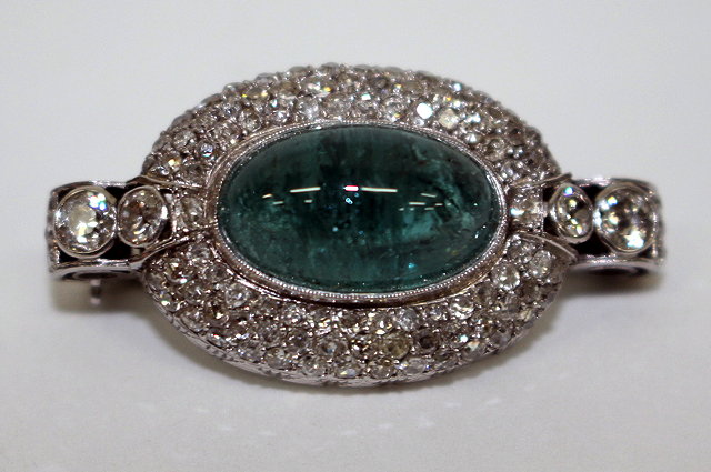 A WHITE METAL AND DIAMOND SET BROOCH with a central green hardstone, 3.5cm wide