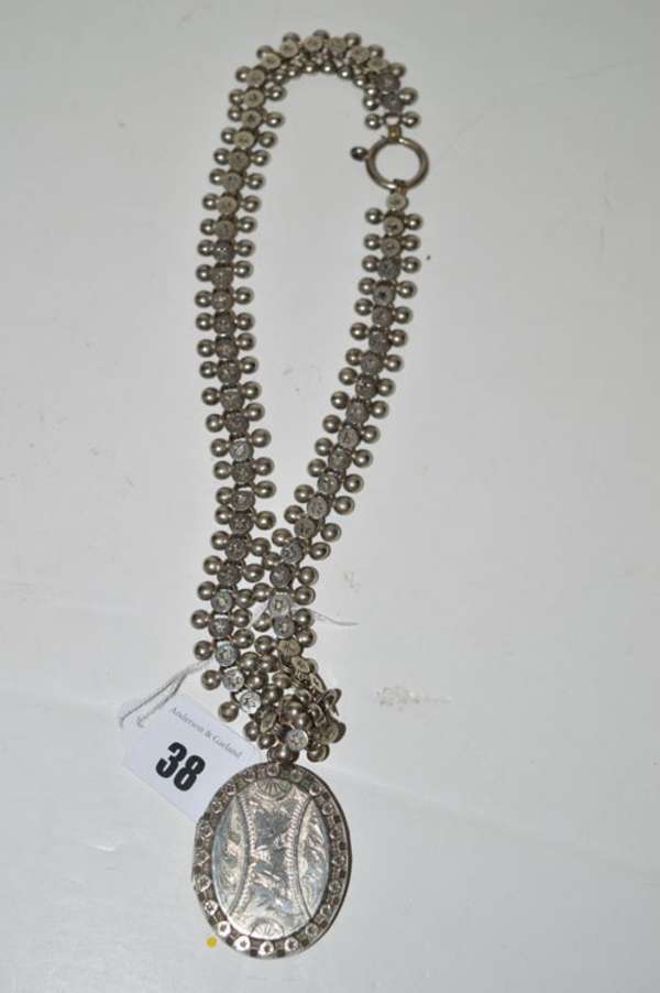 A white metal oval locket pendant, stamped 'JR' (possibly John Round), on a star-cut and beadwork plated chain.