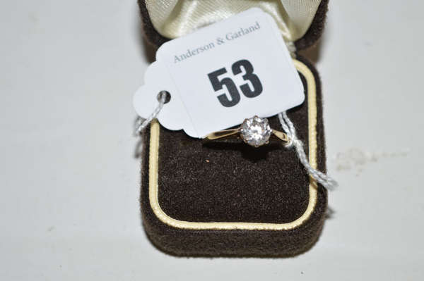 A white stone solitaire ring, the crown mount above chenier shoulders, on 9ct. gold shank, ring size N.