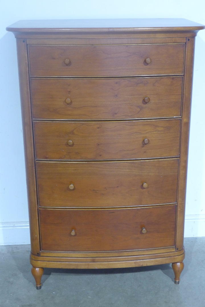 A Willis and Gambier cherry wood bow fronted chest of five graduated drawers on baluster legs - matching previous lot