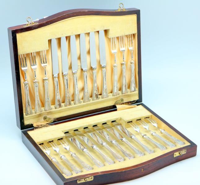 Gecontourneerd a hollow handle with decor of scrolls. The blades and forks base. England, Sheffield, James Dixon. Jl. 1931-1932. Z. 925. Hover to zoom