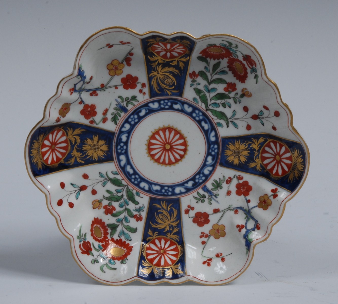 painted with alternating blue and white panels painted with chrysanthemum mons and prunus, gilt rim