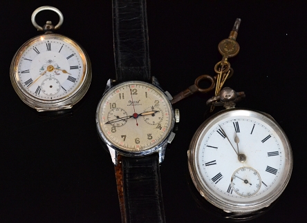 A World War Two period gentleman's stainless steel Ogival antimagnetic wrist watch with circular silvered dial, Arabic numerals and twin subsidiary dials, lume hands all within stainless steel Acier Inoxidable case to black leather strap, together wi