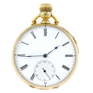 Yellow metal case, stamped 18K. Unsigned keyless wind movement with cylinder escapement and repeating complication. White dial with Roman numeral hour markers, subsidiary seconds dial to six. 49mm. 96gms