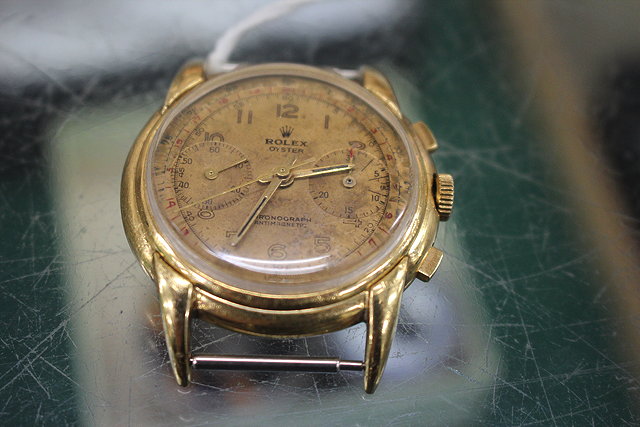 A YELLOW METAL WRIST WATCH with chronograph type dial 3.5cm diameter