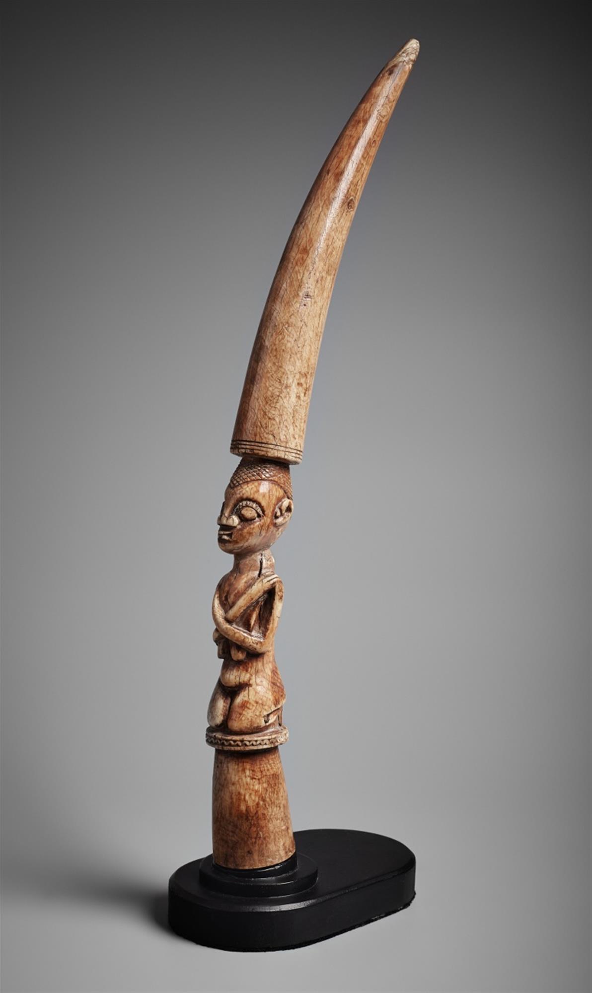 Iroke ifa, a kneeling female figure carved at the centre with her arms folded across her chest, pale brown patina.