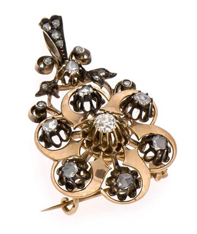 Altschliff-Diamant-Brosche/Anhänger GG 585/000 mit Altschliff-Diamanten 0,50 ct l.get.W/VVS und Diamantrosen, L. 44 mm, 10,4 g