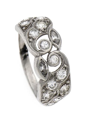 Altschliff-Diamant-Ring Platin mit 14 Altschliff-Diamanten und 2 Diamant-Navettes, zus. 0,80 ct get.Weiß-Weiß/VS-SI, RG 56, 5,2 g