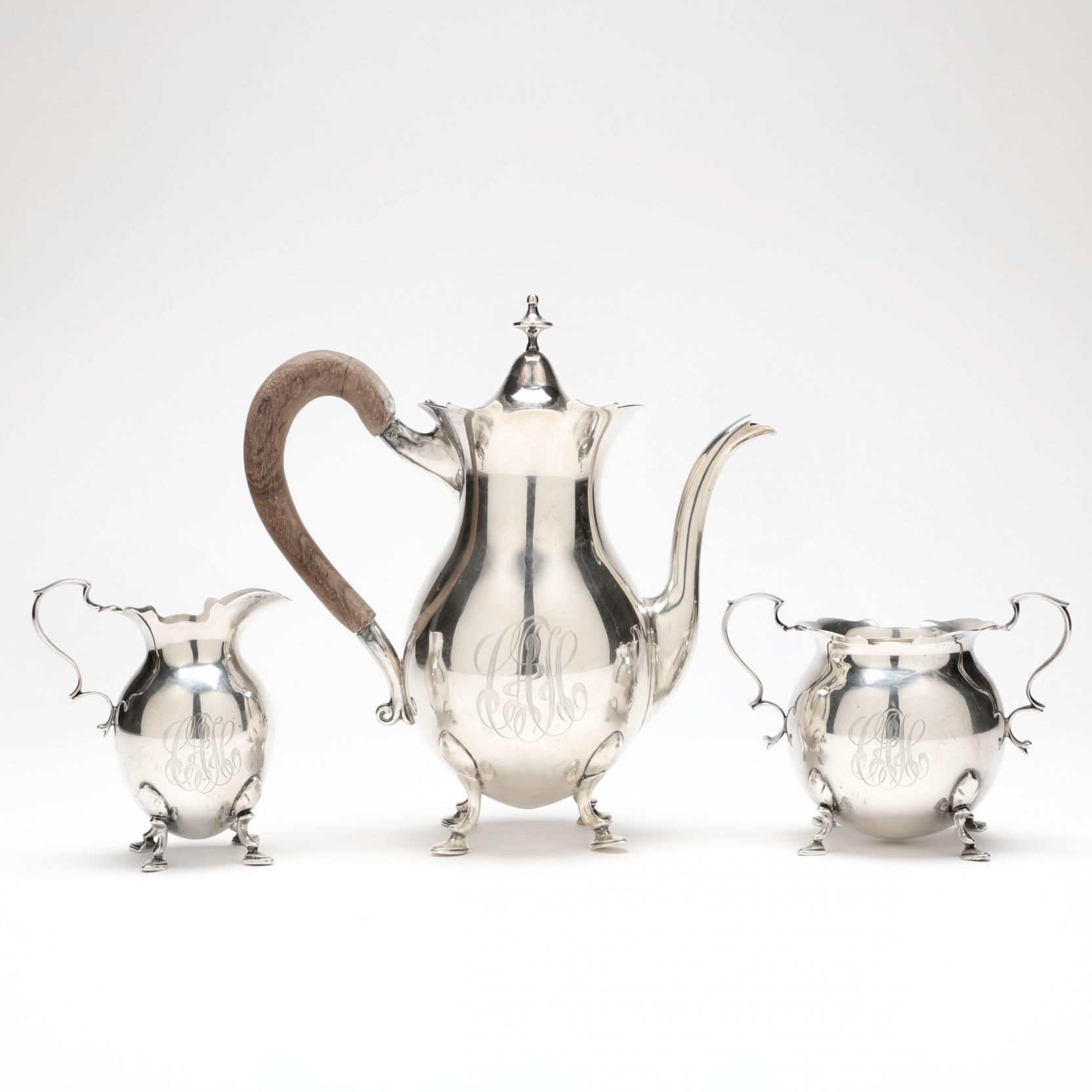 in the 18th century style, by Peter L. Krider & Co. of Philadelphia, each with period ribbon style monogram. The three piece set including a coffee pot (8.25 in.), sugar bowl and cream jug. Weight 24.3 total troy oz