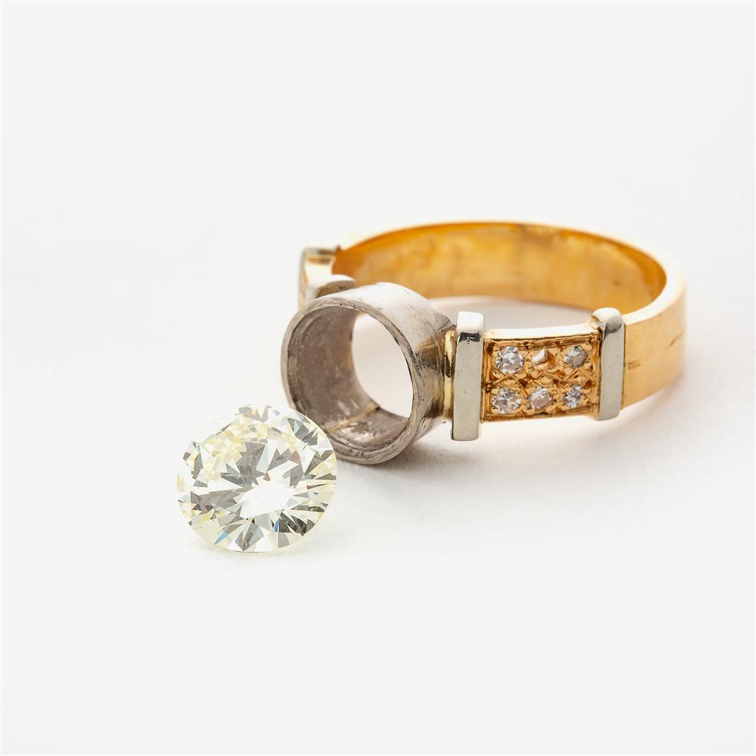 Centred by a brilliant-cut diamond weighing 2.05 ct, with an HRD grading report numbered 180000177193 stating that the colour is M and the clarity is SI1, the central diamond surrounded by 11 diamonds. Gross weight approx. 7.8 g Ring size 58/18.5 One