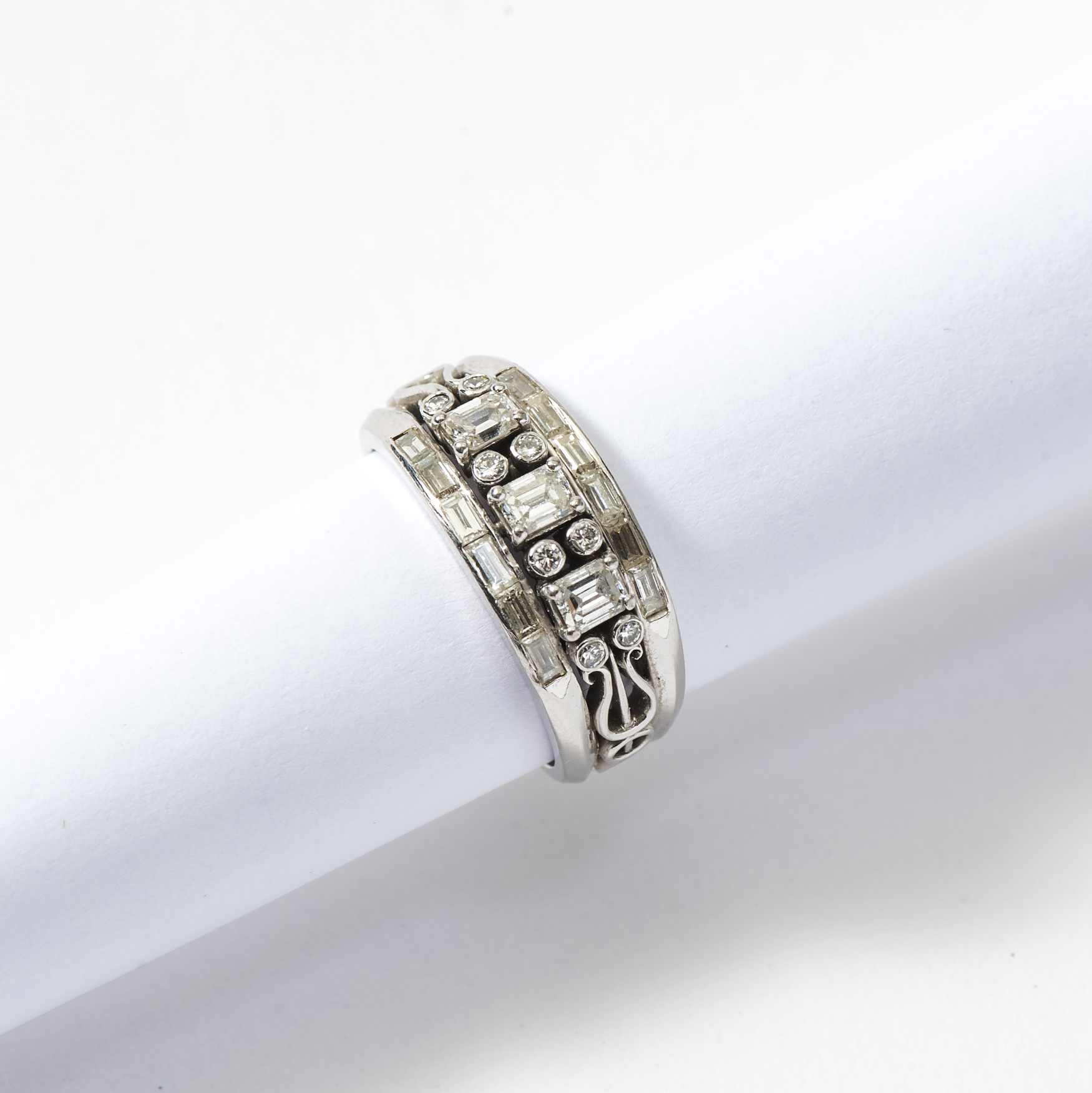 Centred by three emerald-cut diamonds flanked on either side by eight brilliant-cut diamonds. Ring size: 55 / 17. Gross weight approx. 7.2 g. Note:. Attributed to John van der Vet Amsterdam