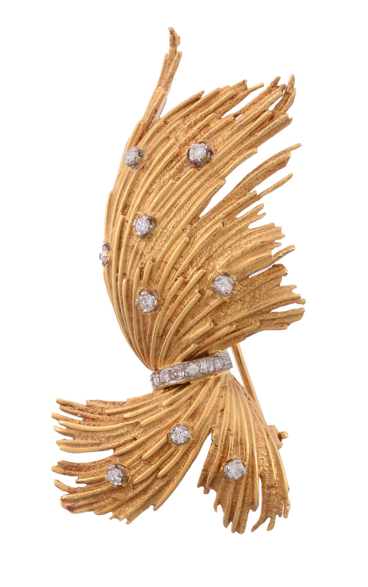 the textured brooch of radiating design, with brilliant cut diamond accents, 18 carat gold London hallmark, 20.6g gross, 6cm long