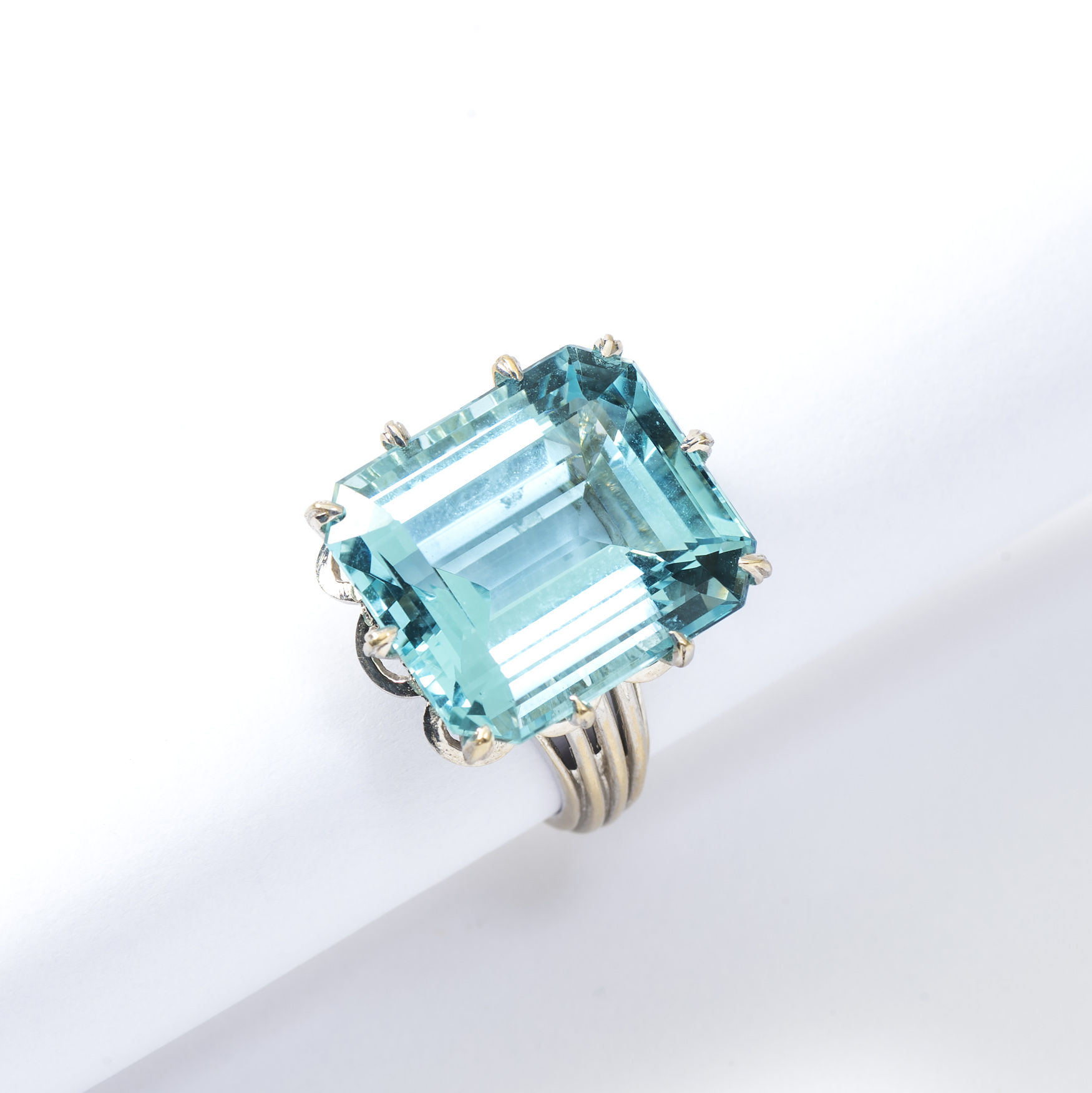 Centred by a step-cut aquamarine measuring 17.93 x 15.50 x 9.64 mm estimated to weigh 20.00 ct. With French assay marks. Gross weight approx 11.3 g. Ring size 55 / 17.5. Graded and measured in mount