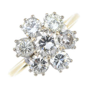 The brilliant-cut diamond cluster, to the tapered shoulders and plain band. Accompanied by mini report number 20026255, from AnchorCert, stating estimated total diamond weight 2cts, H-K colour, SI-I1 clarity. Hallmarks for London, 1978. Ring size M.